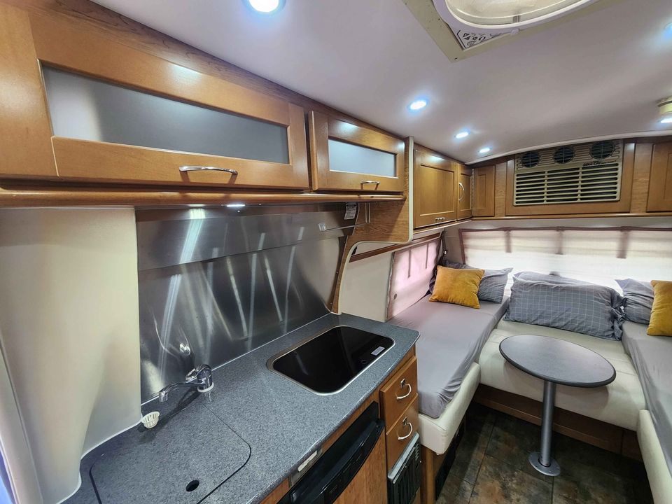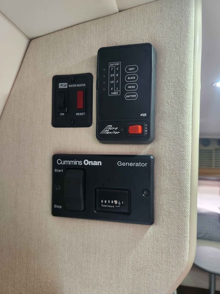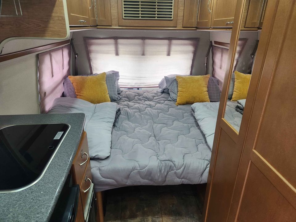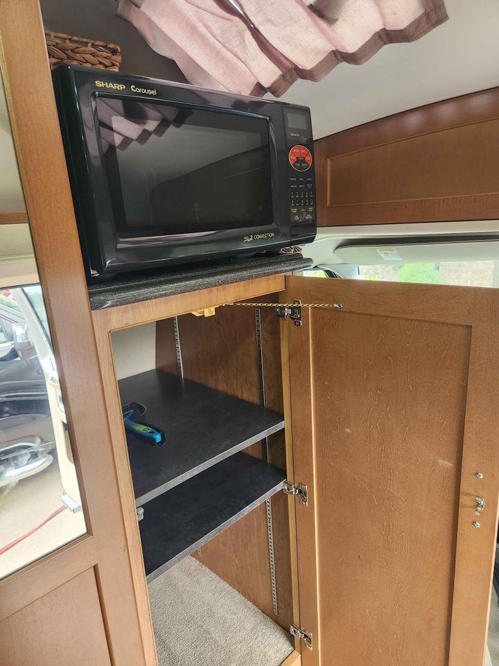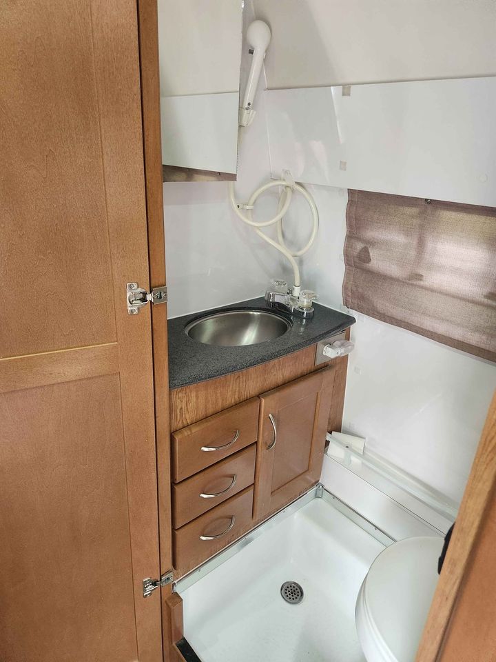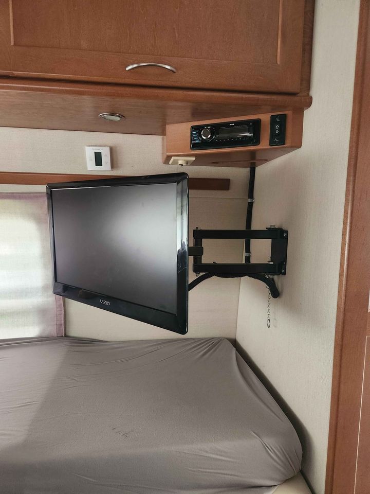 4 studded snow tires (not pictured) with wheel rim covers; Back-up camera; Shore power cord; Driver and passenger seat covers; Exterior Instant Shower Tent with storage bag; 4 Leveling blocks with carrying case; Two twin size mattress toppers (when you want 2 beds), king size mattress pad (when you want one bed), 2 full size comforters; pillows; drawer locks to prevent opening while traveling; flat screen TV with swivel arm; Black and gray tank clean out kit